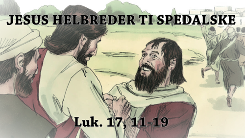 Dette hellige evangelium skriver evangelisten Lukas: Under sin vandring mod Jerusalem fulgte Jesus grænsen mellem Samaria og Galilæa. Da han var på vej ind i en landsby, mødte han ti spedalske; de blev stående langt fra ham og råbte: »Jesus, Mester, forbarm dig over os!« Da han så dem, sagde han: »Gå hen og bliv undersøgt af præsterne!« Og mens de var på vej derhen, blev de rene. Men én af dem vendte tilbage, da han så, at han var blevet helbredt. Han priste Gud med høj røst og kastede sig på sit ansigt for Jesu fødder og takkede ham; og det var en samaritaner. Jesus spurgte: »Var der ikke ti, der blev rene? Hvor er de ni? Er det kun denne fremmede, der er vendt tilbage for at give Gud æren?« Og han sagde til ham: »Stå op og gå herfra! Din tro har frelst dig.«