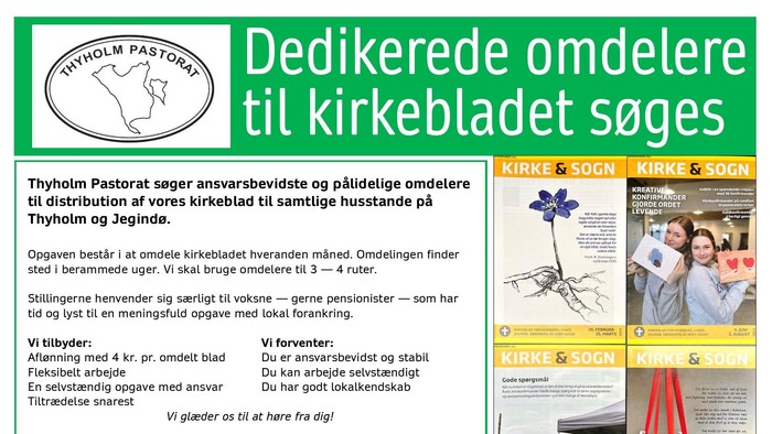 Der søges omdelere af kirkebladet. Der er tale om honorarbetalt løn. Læs stillingsopslaget her:Omdelere søges!